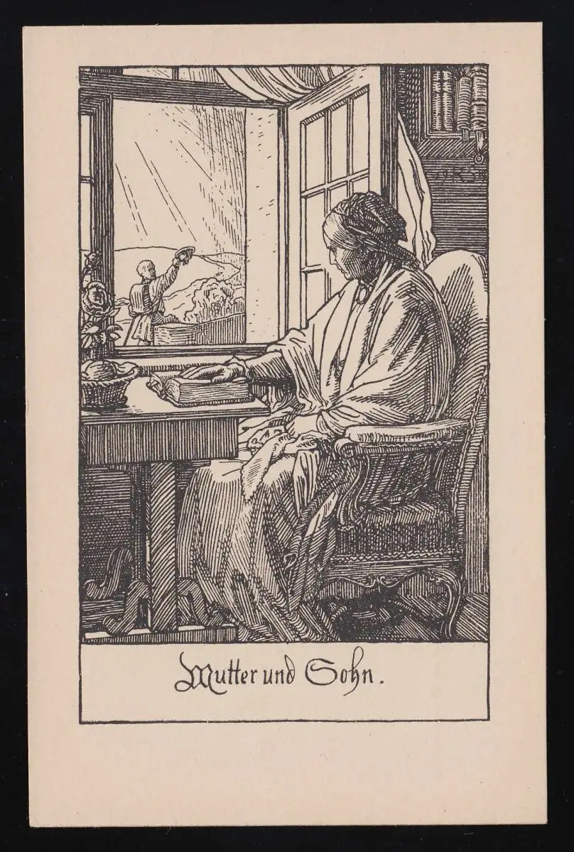 Mère et fils, lithographie femme fenêtre au revoir, Rudolf Schäfer, inutile