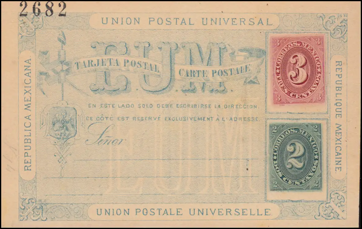 Mexique Carte postale chiffre 3 cent. rouge et 2 centimes vert 1882, non utilisé **