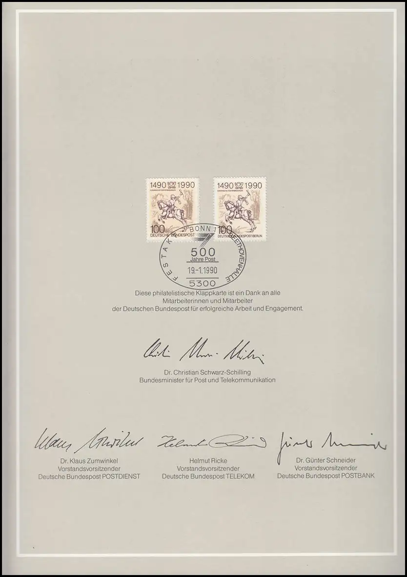 Carte spéciale ministérielle 500 ans en Europe 1990, Faks. des présidents de poste, avec tous les timbres spéciaux 7-12.89 + 1444, accompagné du numéro de catalogue: 1445MiSK1 Examen: original Numéro d'article: 58100199002602