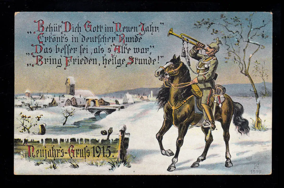 Militaria AK Salut du Nouvel An 1915 Trompeter sur cheval inutilisé avant la culture hivernale