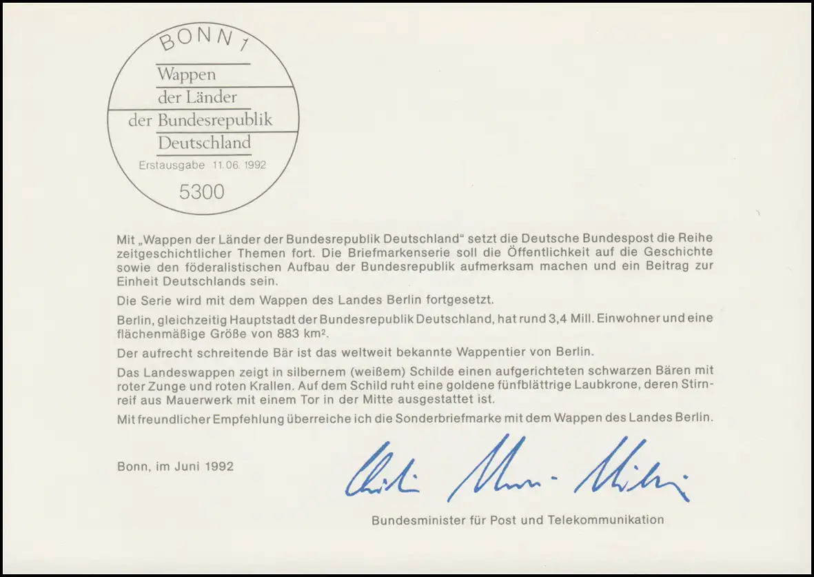 MinKa 25/1992 Armoiries des Länder de Berlin avec autographe Christian Schwarz-Schilling