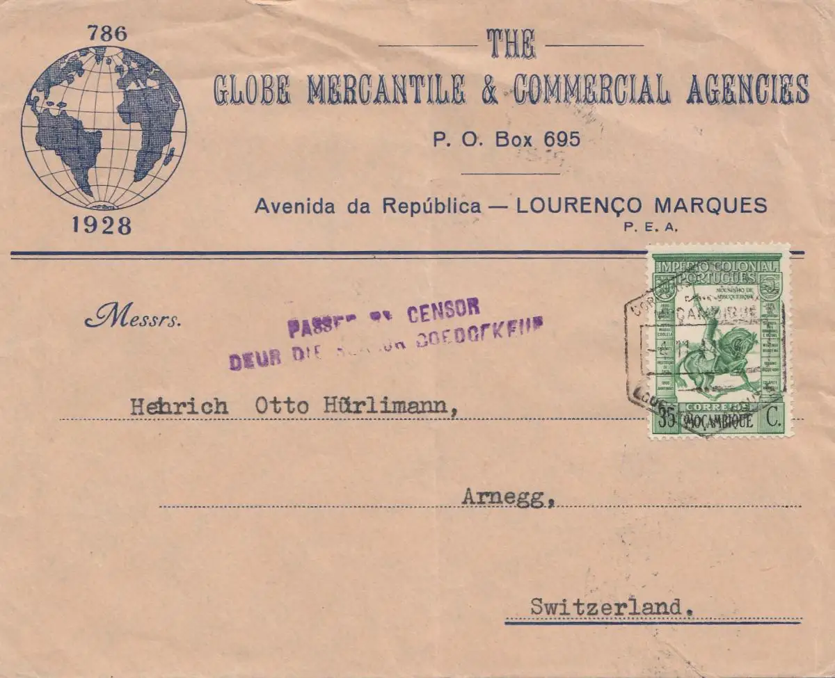 Mocambique 1944 Lourenco to Arnegg/Switzerland, Censor