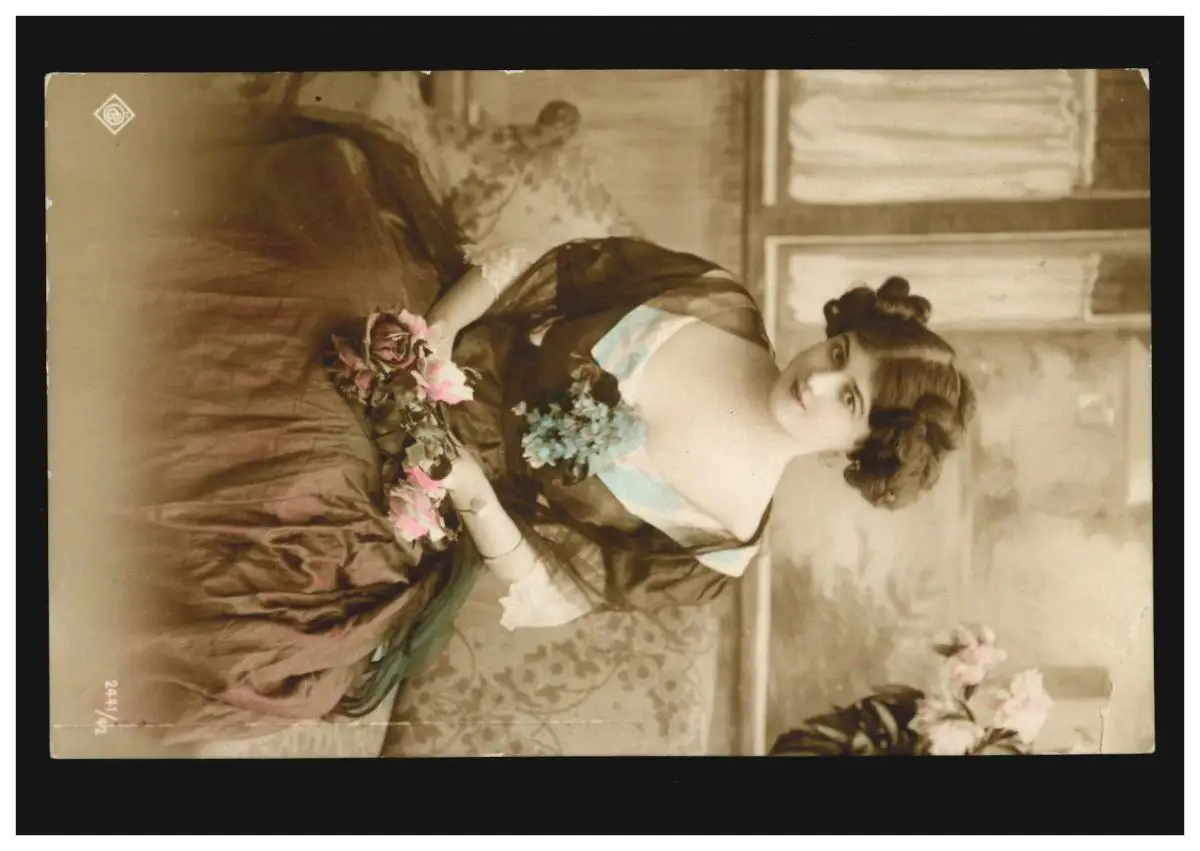 Mode AK femme assise avec décolleté bleu et roses roses, inutilisé