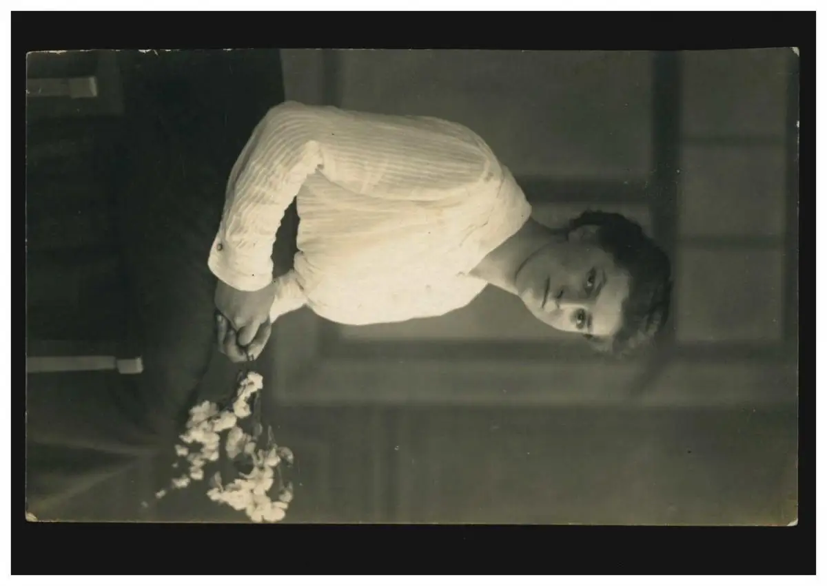 Mode AK femme avec chemisier blanc et fleurs, censure Cleve P.K., GOCH 14.2.1918