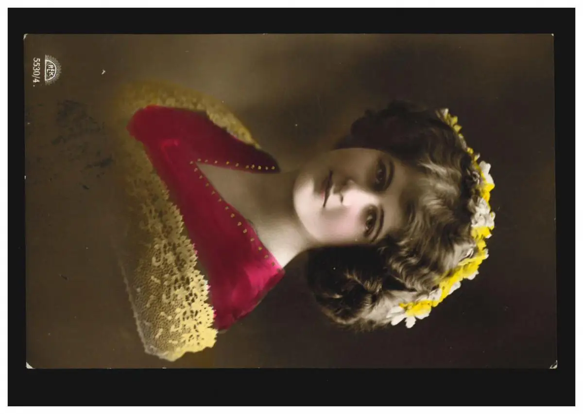 Mode AK femme avec chemisier rouge et bijoux floraux, WITTEKINDSBERG (?) vers 1915