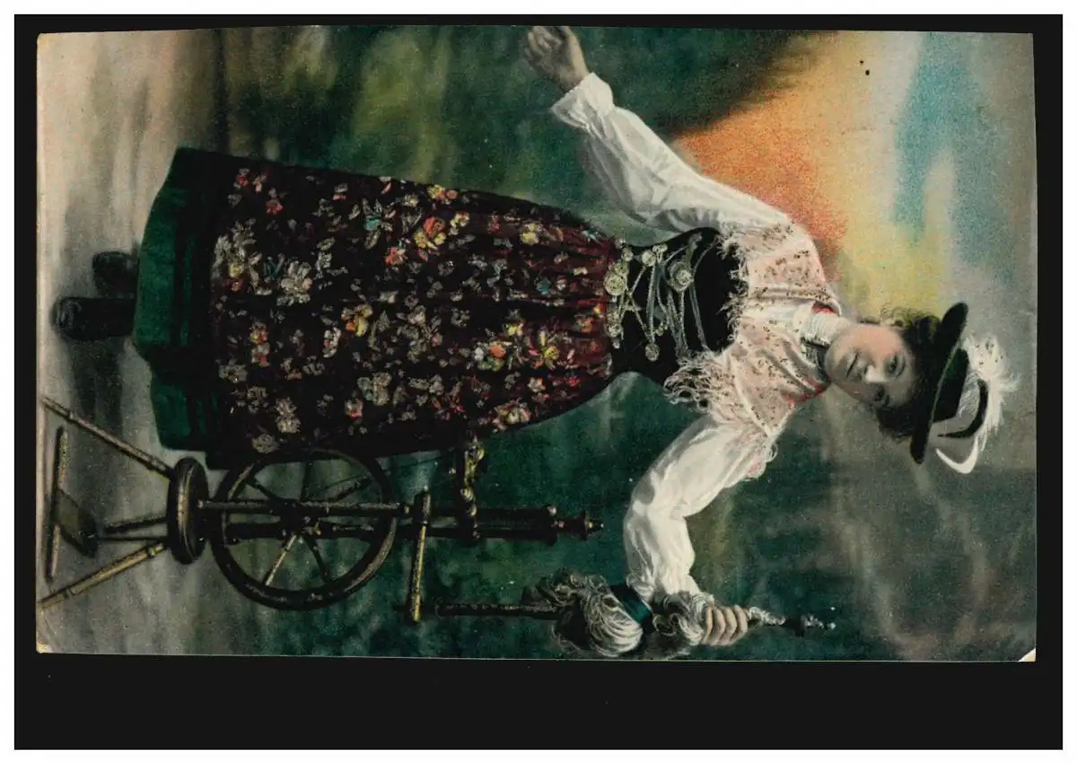 Mode AK femme en costumes avec roue de filage, ASBACH 6.8.1907