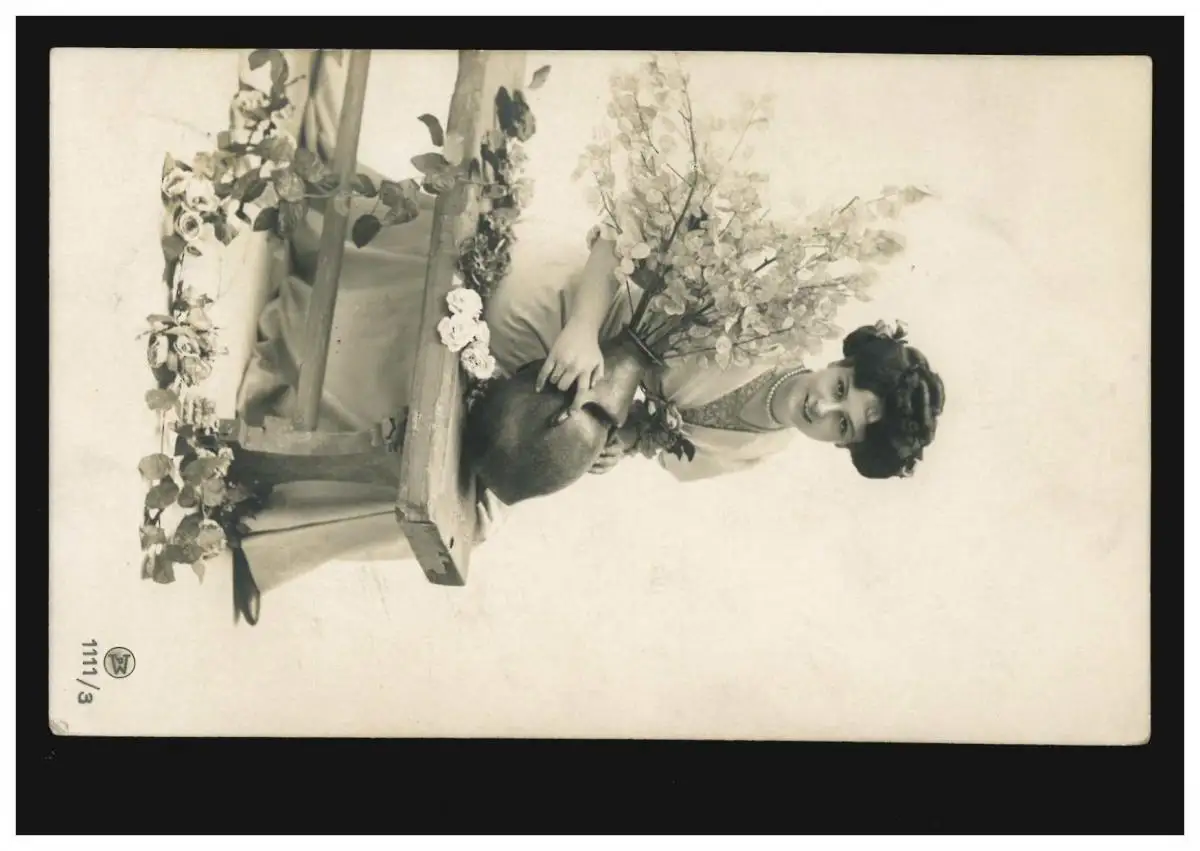 Mode AK femme en robe blanche sur un banc de fleurs girlande MUNICH 16.4.10