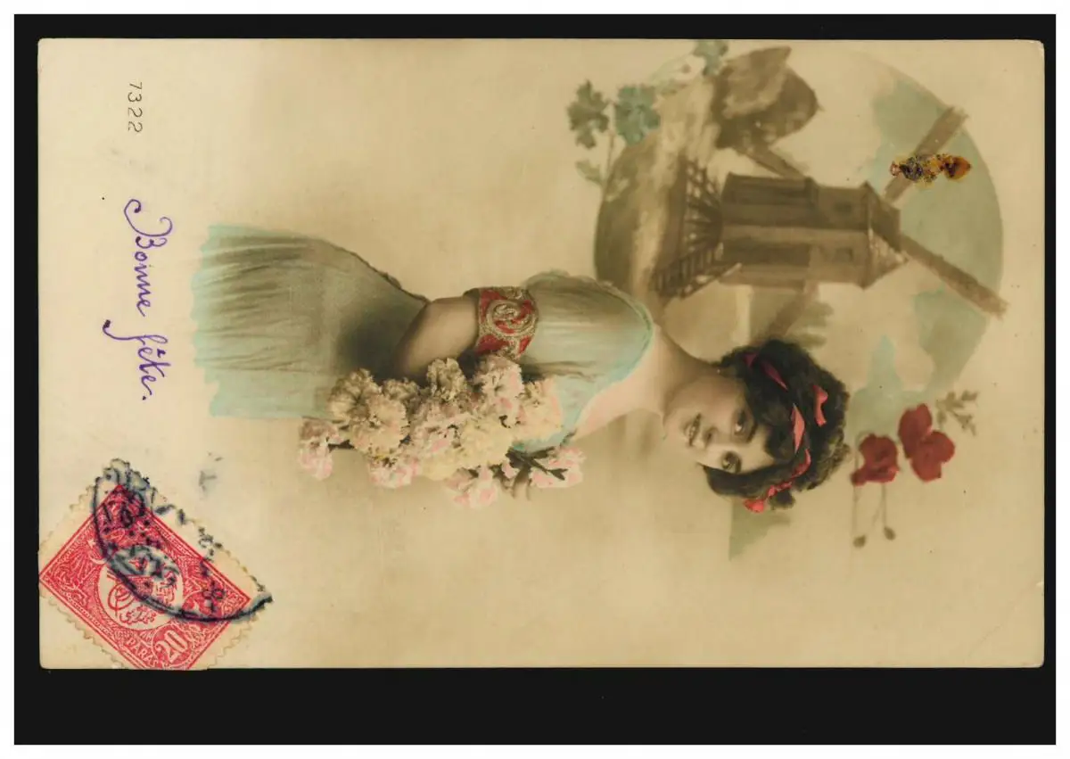 Mode AK femme en robe bleue fleurs moulin à vent, maison d'édition à Pera, marqué
