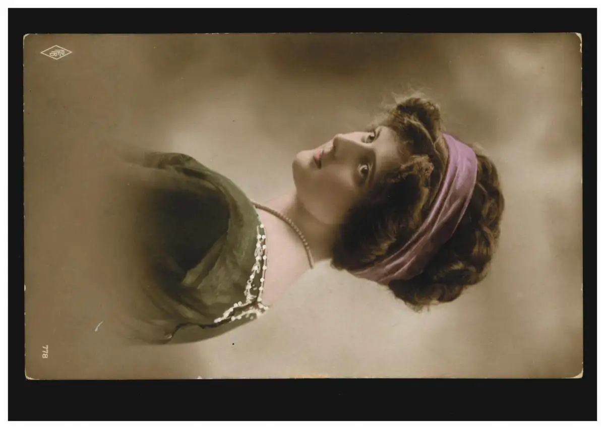 Mode AK femme en robe verte avec bande de cheveux, DÖBEL 5.8.1912