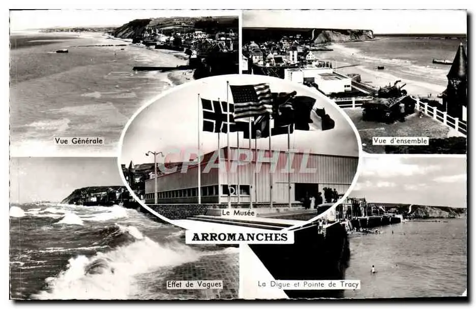 Cartes postales moderne Arromanches Vue generale Vue d'ensemble Char Tank Effet de vagues La digue et pointe de Tracy