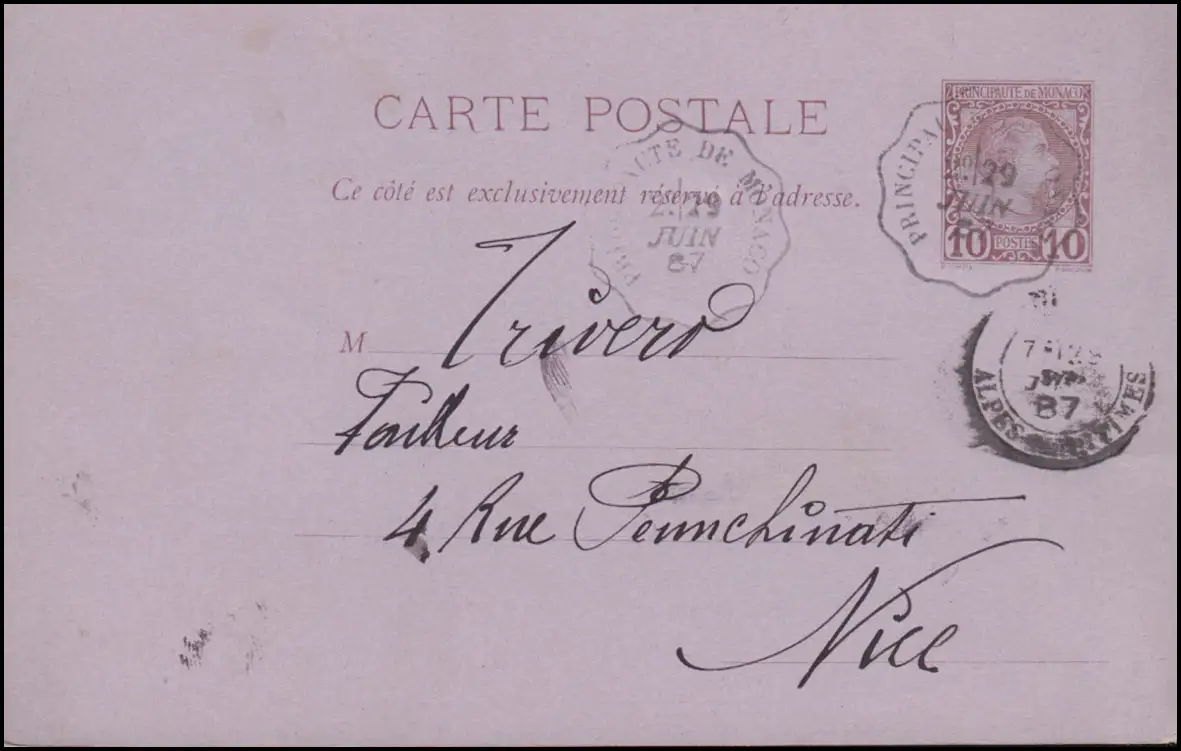 Monaco Carte postale 1 Prince Charles 10 C. Brun rouge de PRINCIPAUTE DE MONACO 29.6.1887