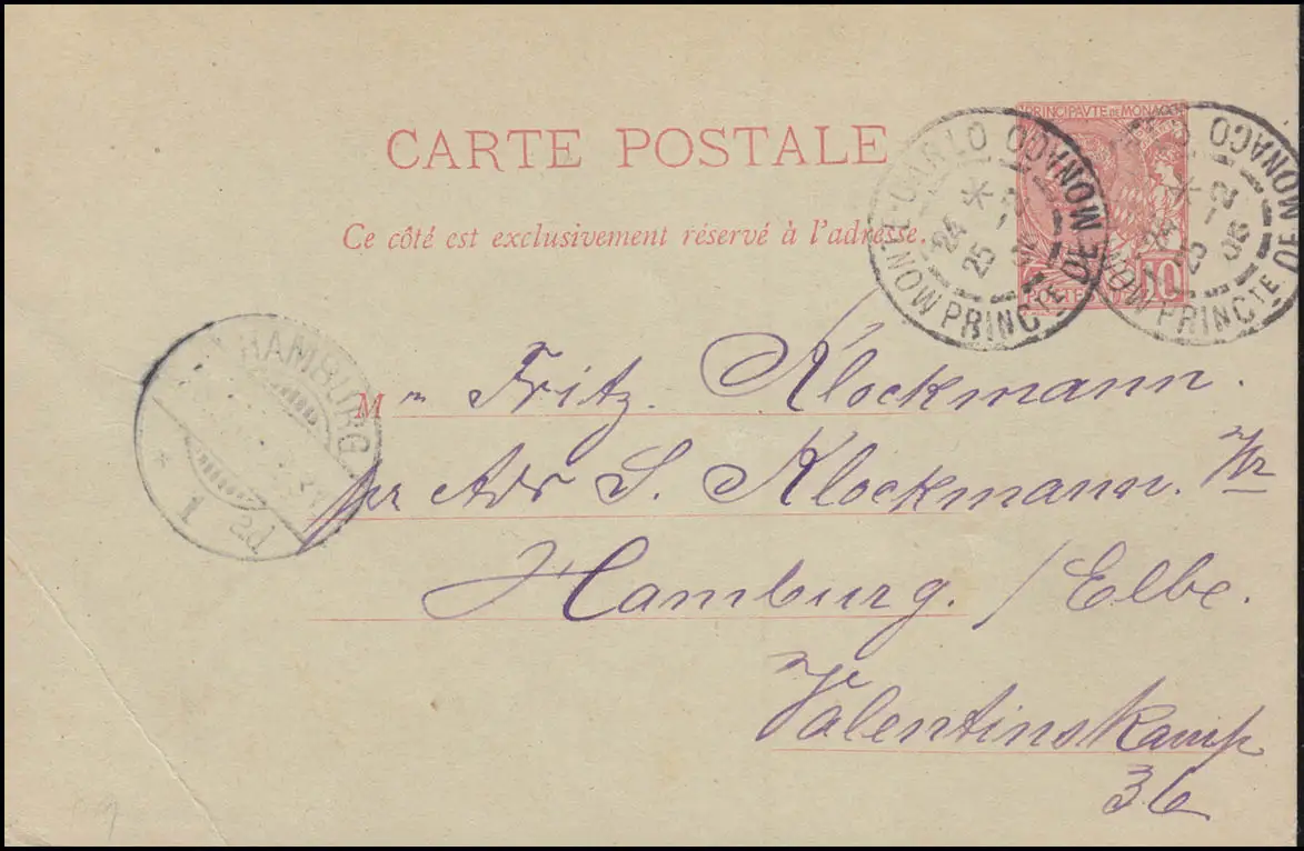 Monaco Carte postale 9 Prince Albert 10 C. MONTE CARLO 25.2.1905 selon HAMBURG 28.2.