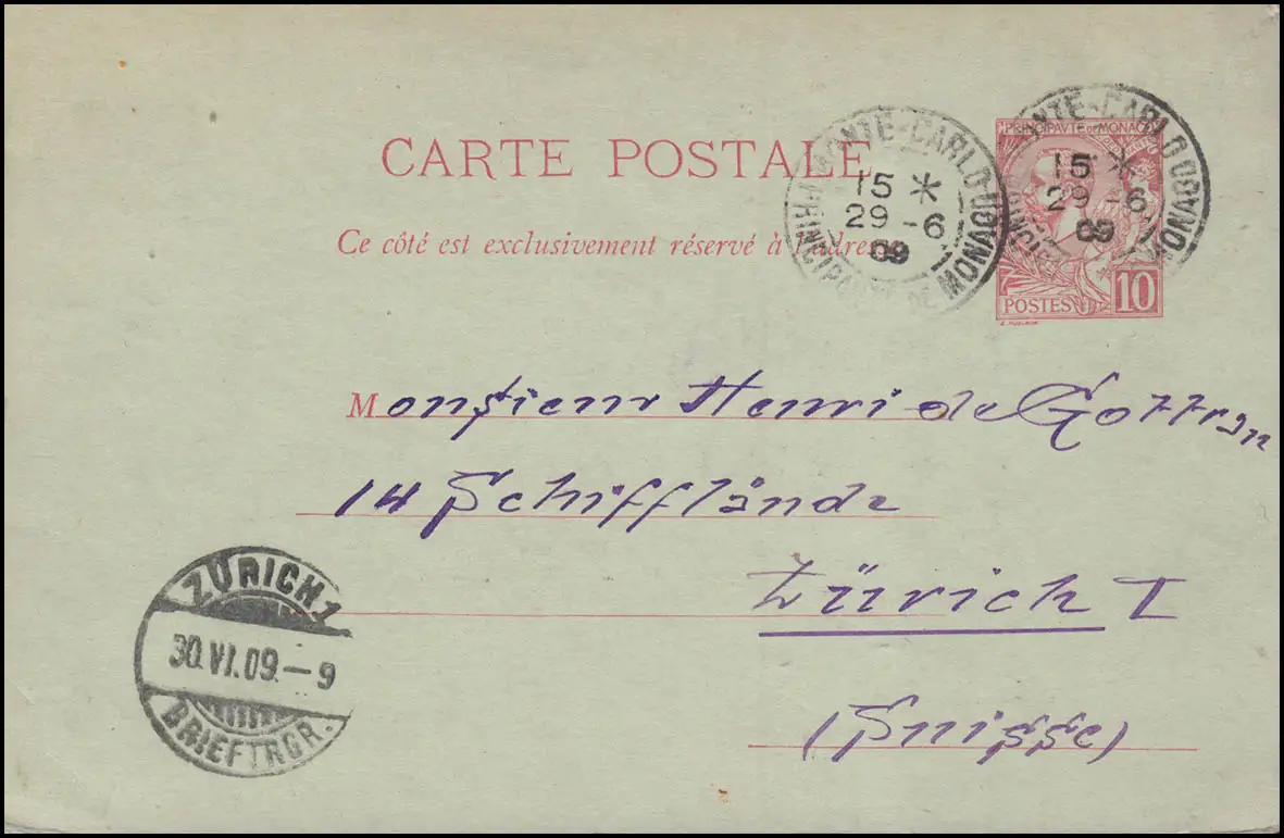 Monaco Carte postale 9 Prince Albert 10 C. MONTE CARLO 29.6.1909 d'après ZÜRICH 30.6.09