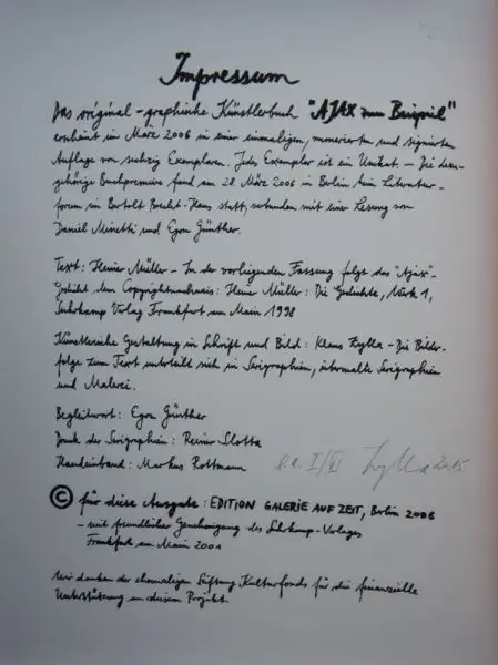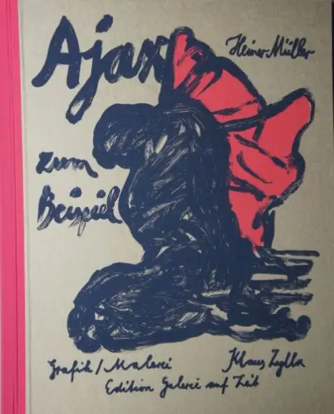 Édition Galerie à temps, Berlin, 2001. Gravure à 2°. Impression de presse. Livre d'artistes graphiques original avec 2 sérigraphies pleines pages, 4 scores peintes et 4 originaux de Klaus Zylla dans une édition de 60 exemplaires. Le poème de Müller ''"Ajax par exemple' est l'un des textes les plus importants de sa phase de création. A la figure de l .Ayax, le poète décrit le déclin de la vieille époque et la confrontation avec le nouveau temps. Chaque livre est un ouvrage de synthèse. Il incarne le non-corrompable; c'est aussi un espoir.
