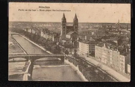 München. Partie an der Isar. Blick gegen Maximilianskirche - Gelaufen 1913. (NPLZ 80000)