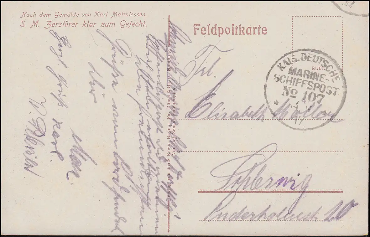 NAVIRE MARINE FRANÇAIS POST No 107 - 1917 SMS Derfflinger sur carte postale de champ