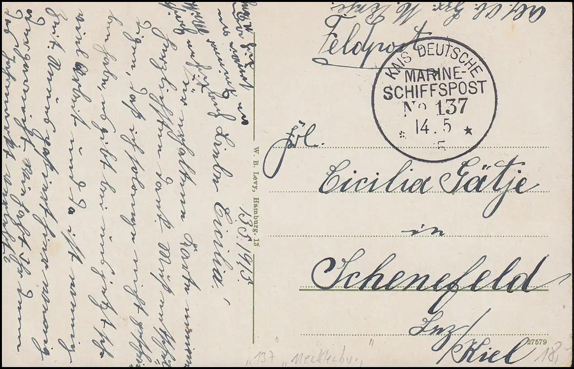 NAVIRE MARINE-FRANÇAIS POST No 137 - 14.5.1915 SMS Mecklembourg sur Feldpost-AK