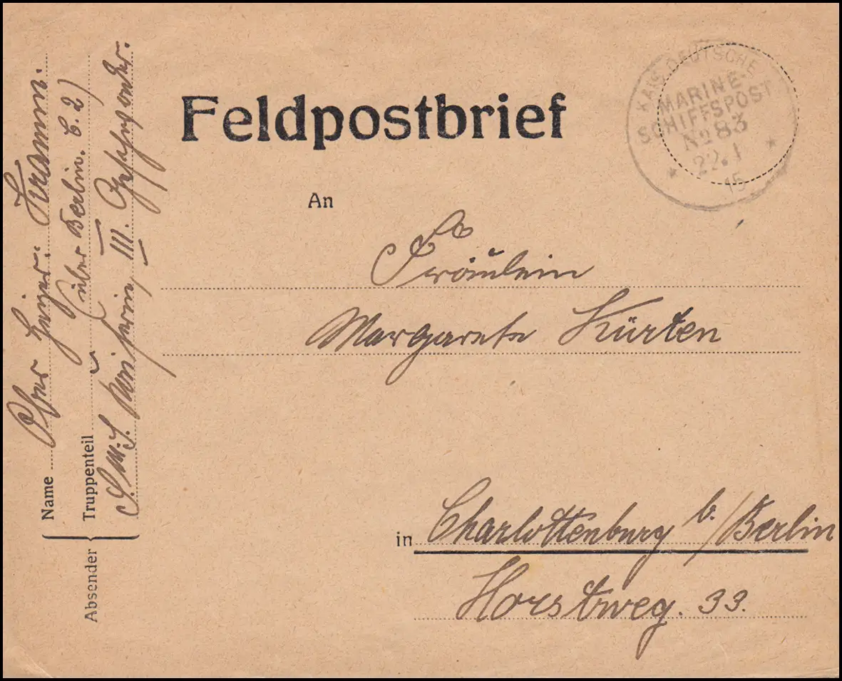 NAVIRE MARINE FRANÇAIS POST No 83 - 22.1.15 SMS Impératrice, Lettre n.Charlottenburg
