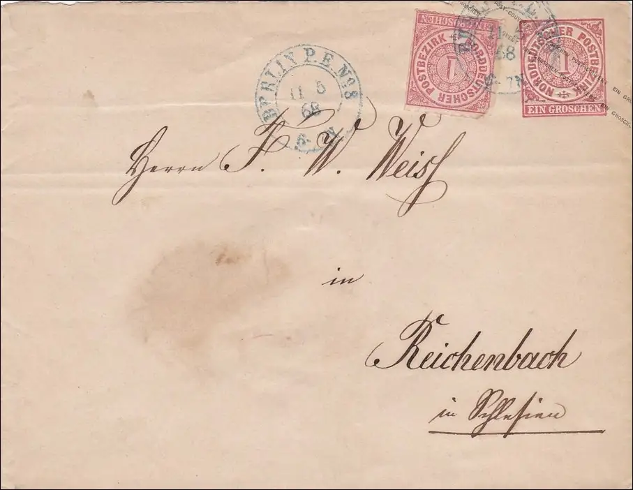 NDP: Enveloppe complète de Berlin PE08 vers Reichenbach 1868