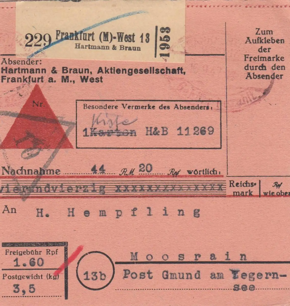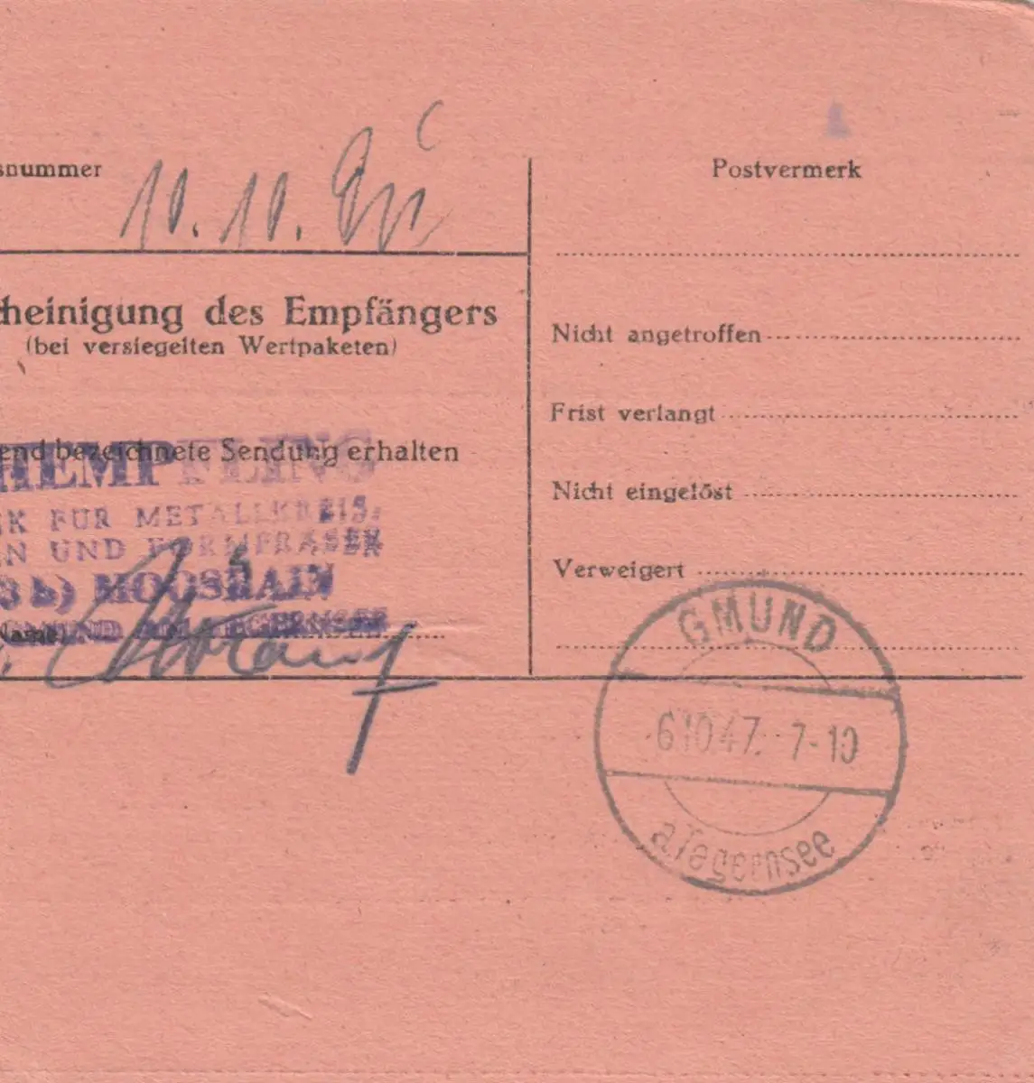 Carte de réduction 1947: Francfort n. Moosrain, auto-réservation, frais payés timbre