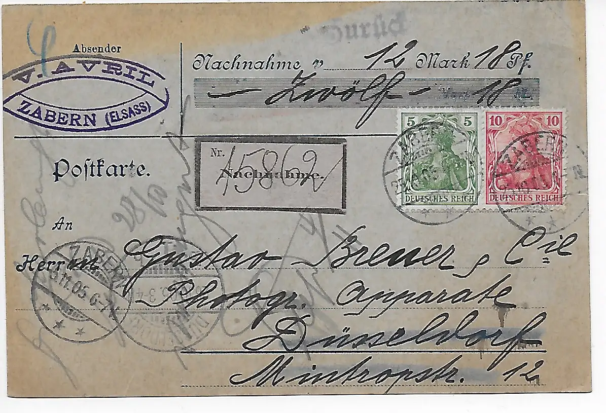 Nom de famille Carte postale de Zabern vers Düsseldorf 1905 et retour