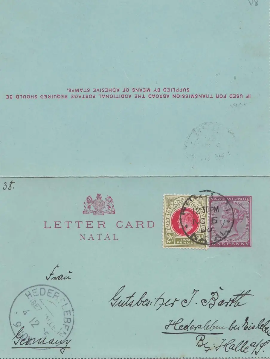 Natal: 1895: letter card to Hedersleben/Hall