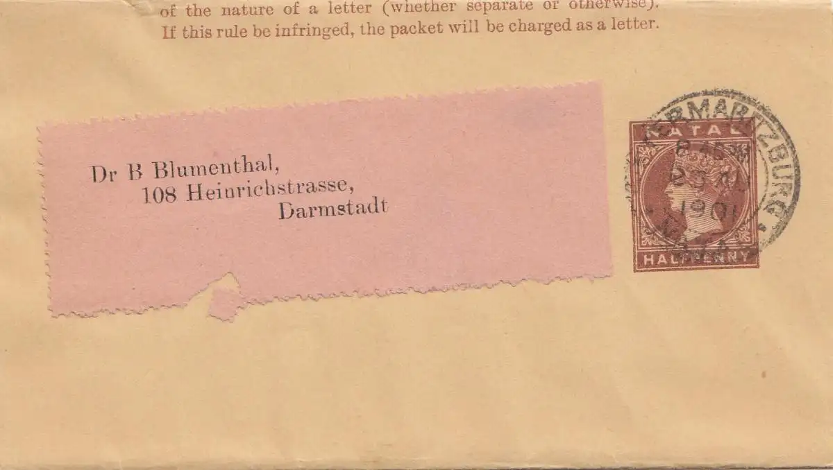 Natal: Wrapper 1901 Ermaritzburg to Darmstadt