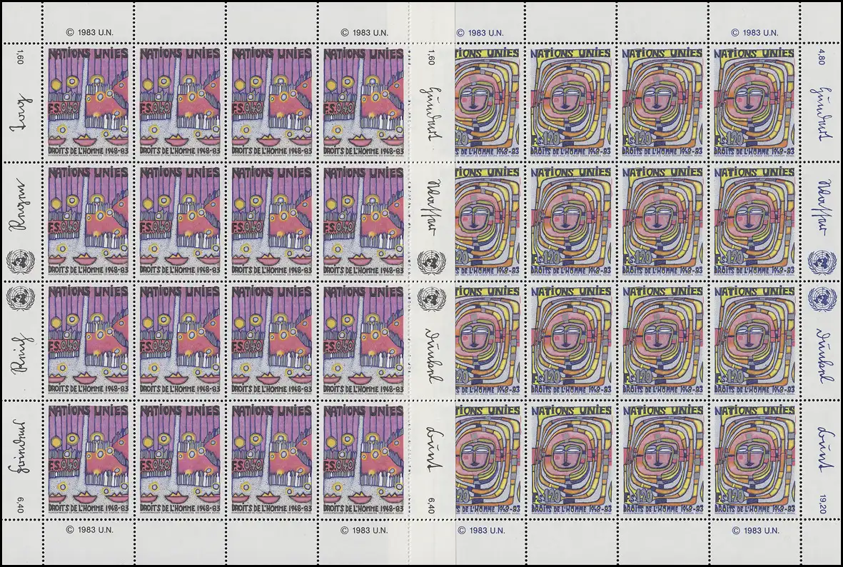 Nations unies Genève 117-118 Droits de l'homme / Hundertwasser 1983, petit jeu de feuilles **