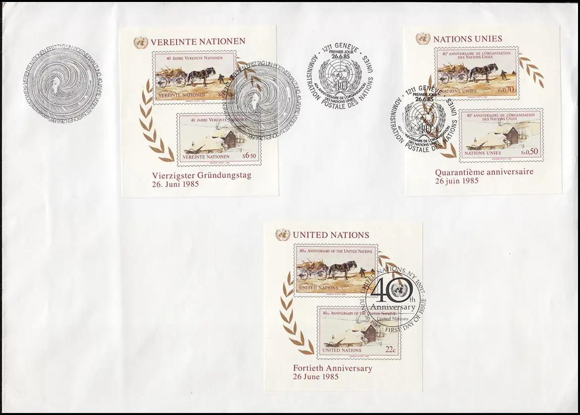 Nations unies Trio-FDC 40 ans UNO: tous les 3 blocs New York, Genève, Vienne avec ESSt sur FDC