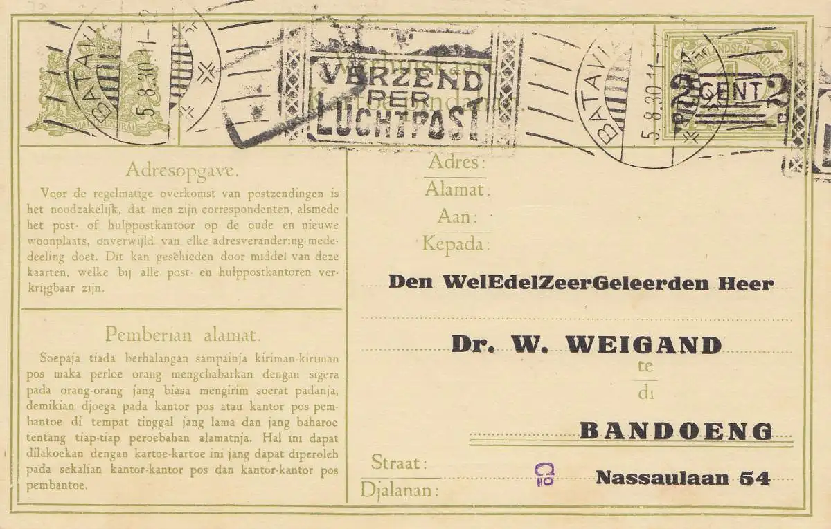 Ned. Indie 1930 Batavia to Bandoeng - post card adress change, cancel Luchtpost