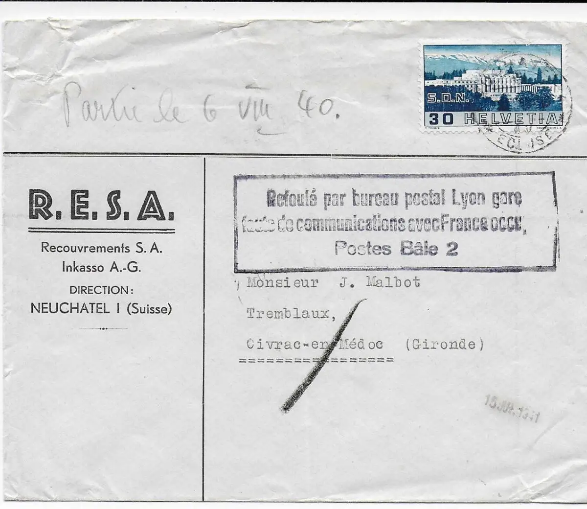 Neuchatel vers Civrac-en-Médoc, transport postal impossible 1940/1941