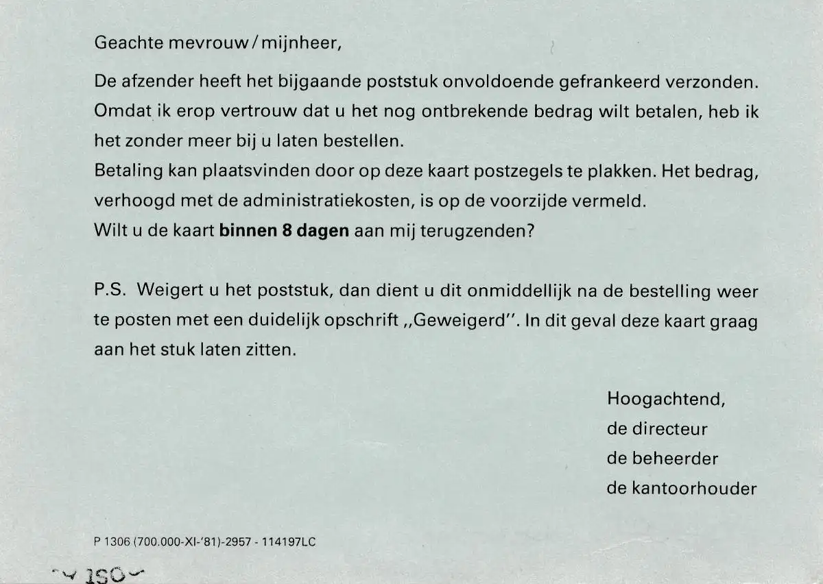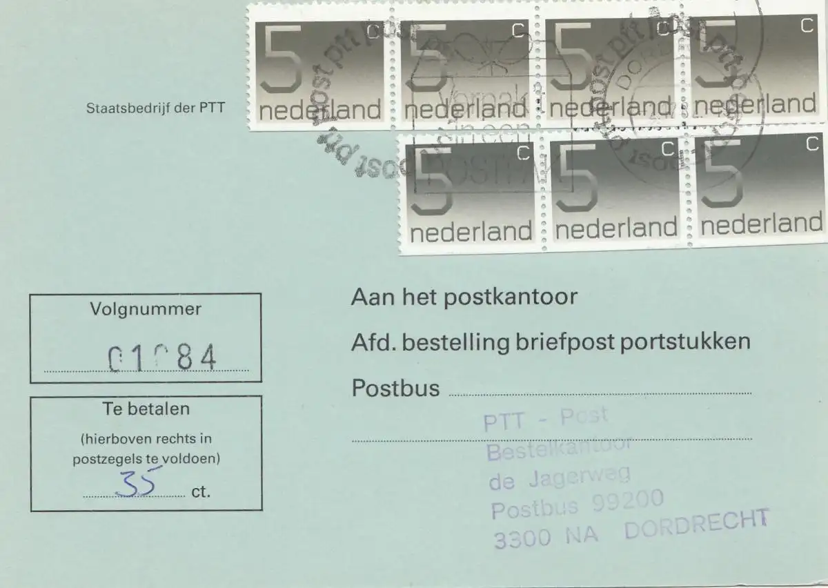 Pays-Bas: 1982: bestelling briefpost portstukken - Pfis PTT Dordrecht