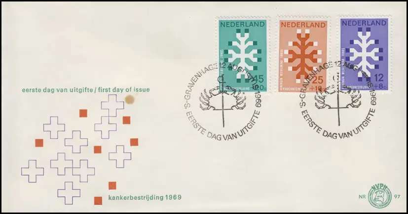 Pays-Bas: 923-925 Fonds KWF Lutte contre le cancer, ensemble sur les bijoux-FDC ESSt 1969