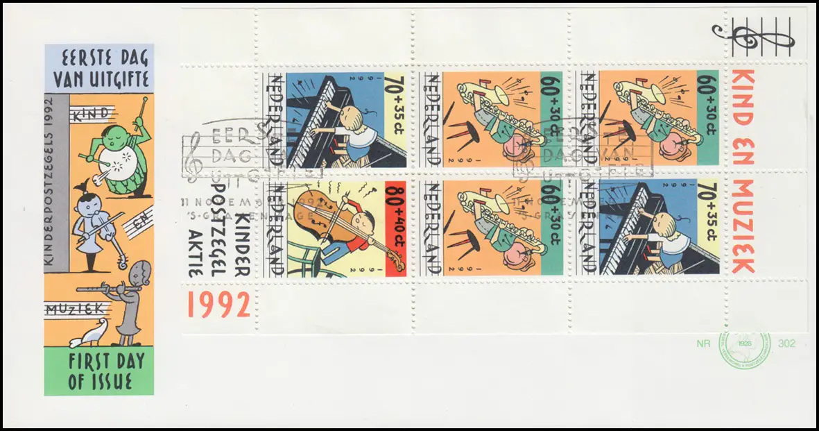 Pays-Bas Bloc de bandes dessinées dessins animés: Les enfants font de la musique, des bijoux FDC 1992