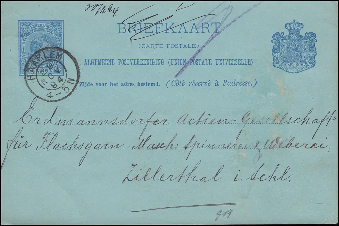 Pays-Bas Affaire entière P 20 Wilhelmine 5 C. von HAARLEM 29.11.94 ins Zillerthal