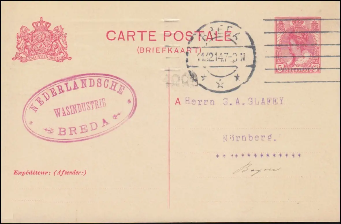 Pays-Bas Carte postale P 46I Wilhelmina 5 C. de BREDA 11.12.14 vers Nuremberg