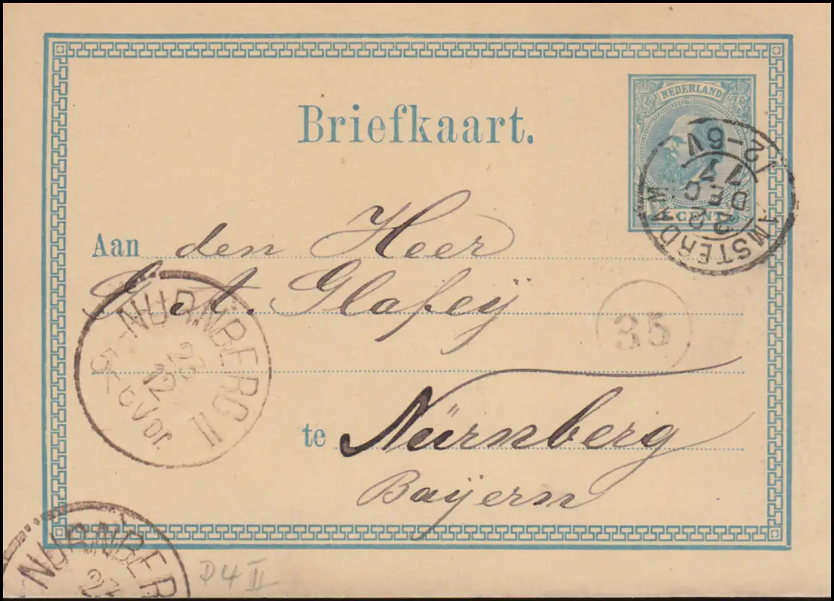 Pays-Bas Carte postale P 4II Wilhelm AMSTERDAM 22.12.1877 vers NÜRNBERG 23.12.