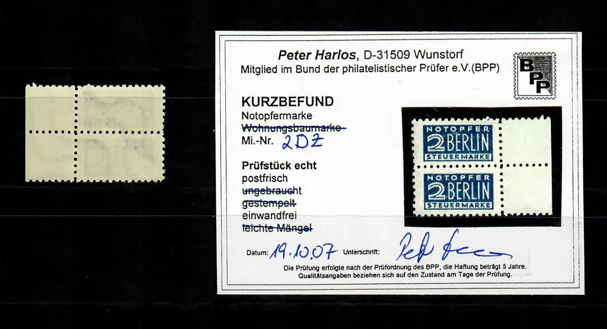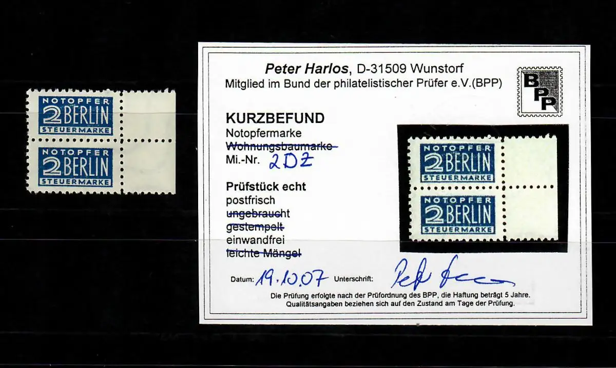 Marque de secours MiNr. 2 DZ, frais, **, BPP Attest