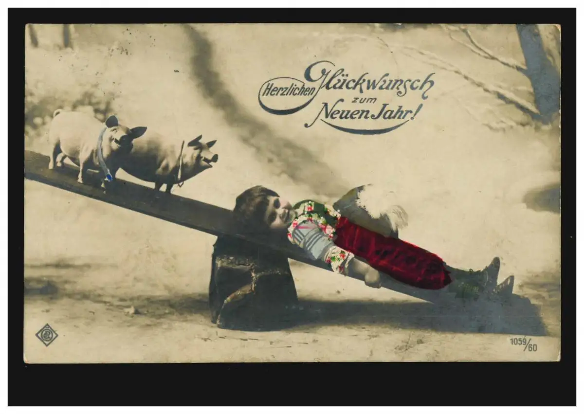 Nouvel An-AK porcs et enfants sur la Wippe, RASTATT 29.12.1908 vers la Belgique