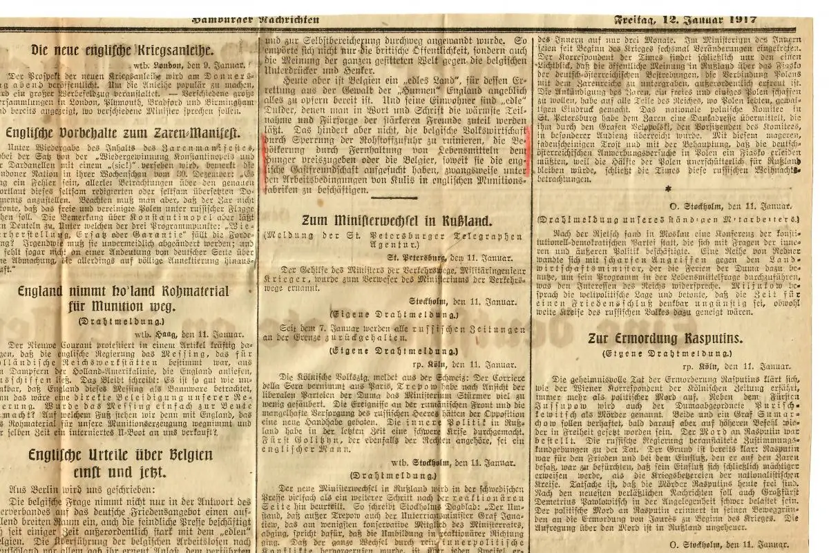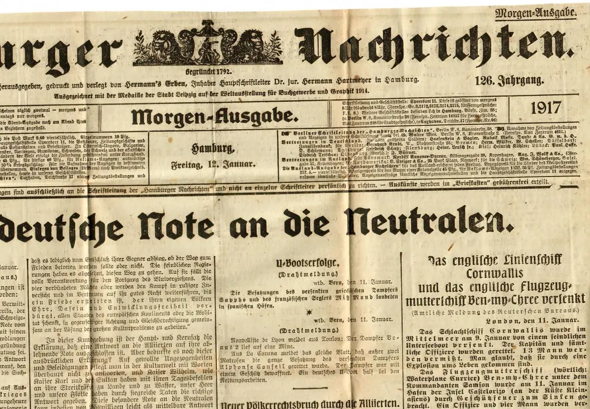 Nouvelles de Hambourg 12.1.1917, A3 taille, plié, beaucoup d'informations