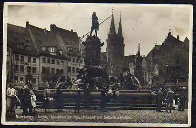 Nürnberg. Neptunbrunnen am Hauptmann mit Sebalduskirche - Gelaufen Briefmarke entfernt