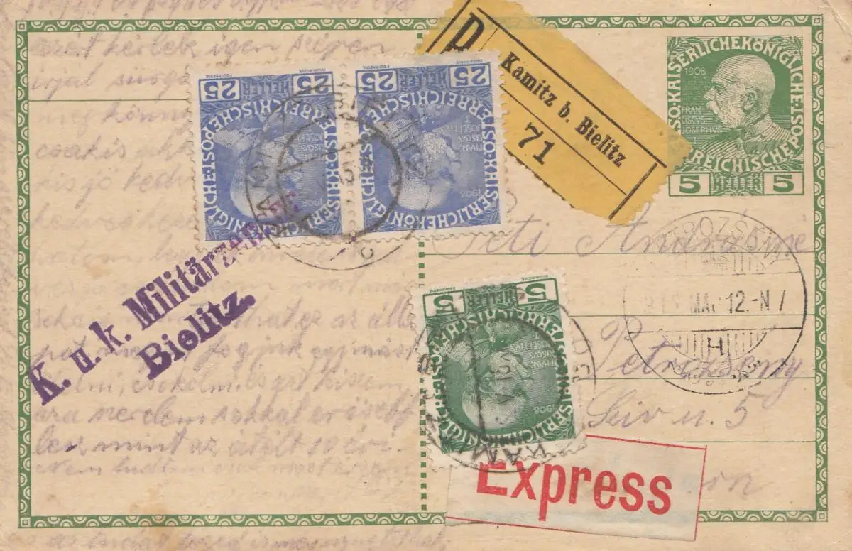 Autriche: 1915: Carte postale recommandée par Bielitz-Express