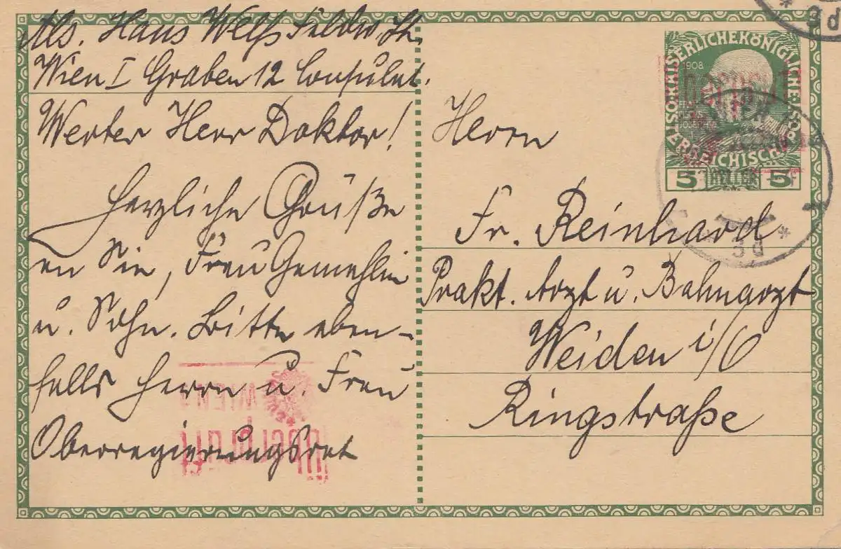 Autriche: 1917 de Vienne à Weiden - entier Vérifié