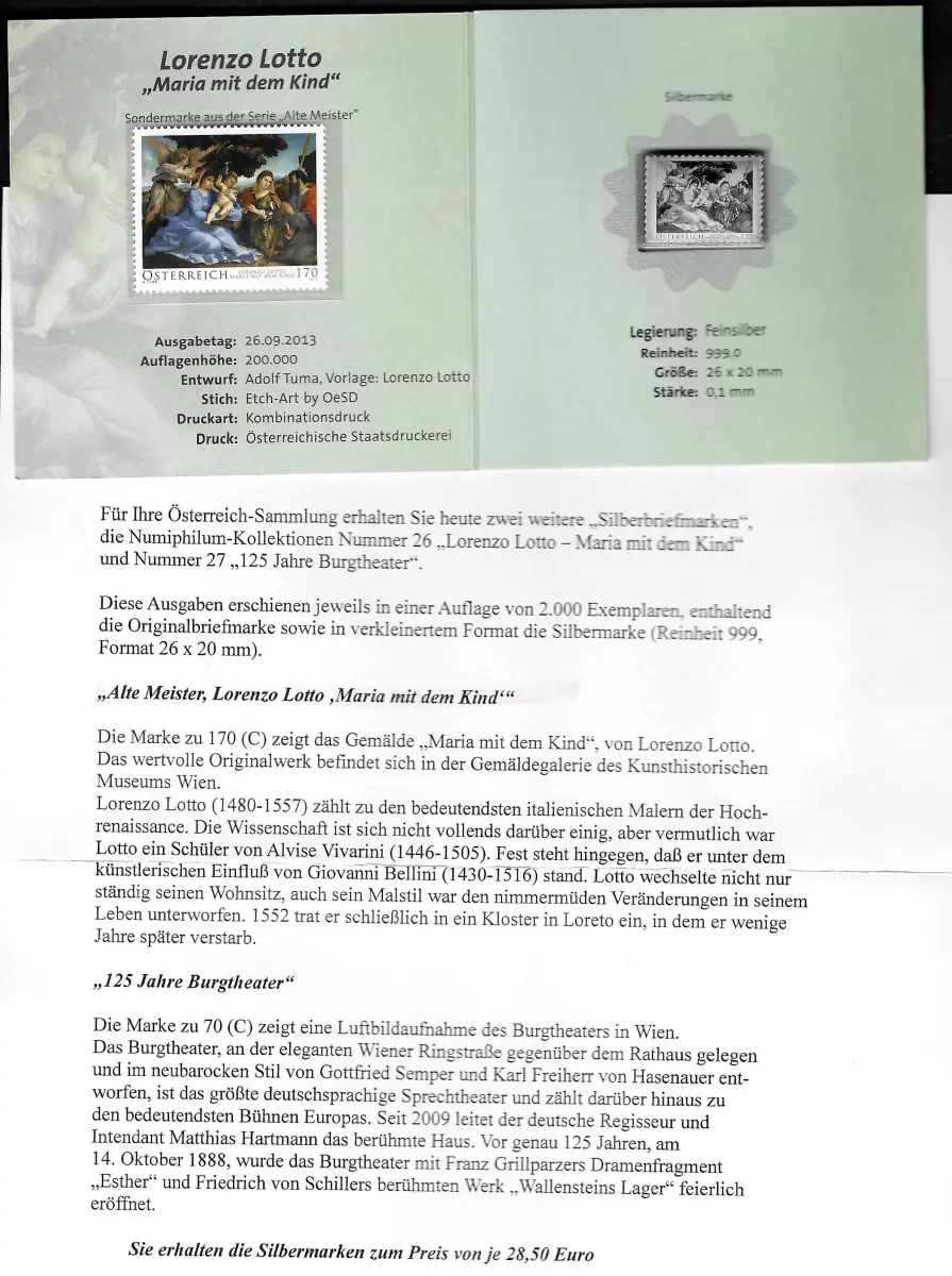 Österreich 2013: Silbermarke #26, Lorenzo Lotto-Maria mit Kind, Feinsilber 999