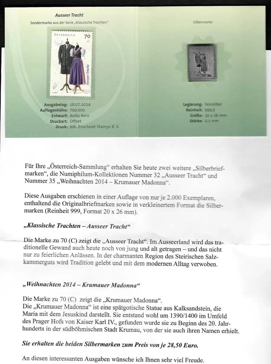 Österreich 2013: Silbermarke #32, Ausseer Tracht, Feinsilber 999