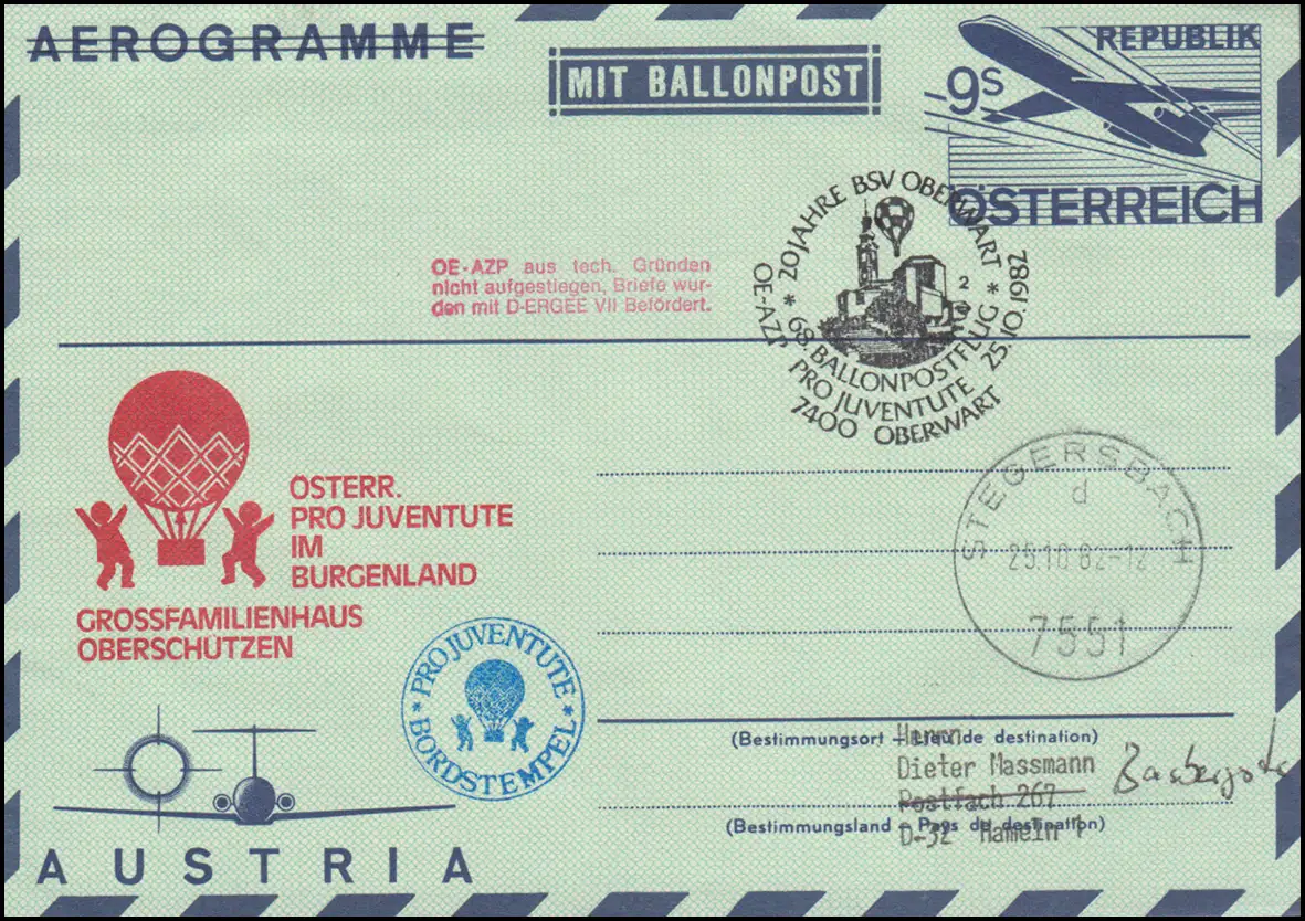 Lettre postale aérienne avec overrduck "AVEC BALLONPOST," cachet spécial approprié 68. Vol postal de ballons par Juventute, bord et cousin PAR JUVENTUTE / HÔPITAL DE GRANDE FAMILLE, cachet de transport "OE-AZP n'a pas monté pour des raisons techniques, lettres ont été transportées avec D-ERGEE VII.", Tampon d'arrivée STEGERSBACH 25.10.82 N° de référence: LF19 Examen: original Numéro d ' article: 00000000033643>Note: Cet article n \'est disponible qu'une seule fois. Vous recevrez exactement l'article représenté.