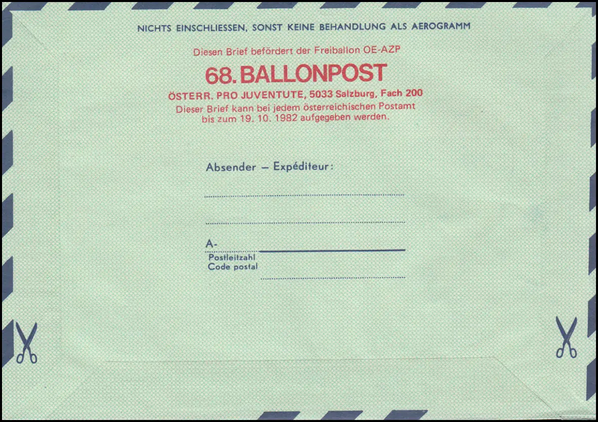 Autriche Aerogrammes LF 19 BALLONPOST OE-AZP 68. Vol en ballon Oberwart 25.10.1982