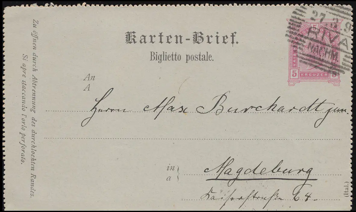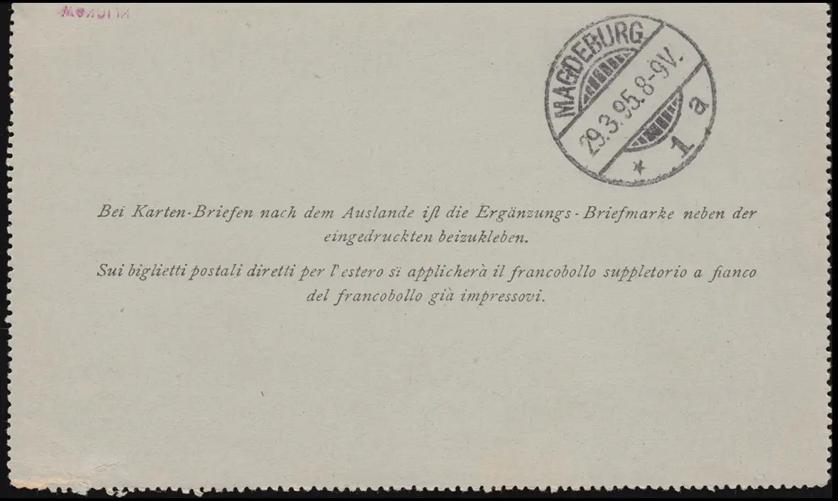 Autriche Carte-lettre K 22 RIVA 27.3.1895 n. MAGDEBURG 29.3.95, audité KLICKOW