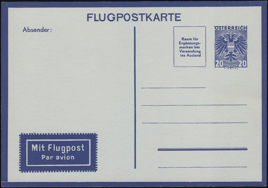 Carte postale aérienne / Carte postal aérienne/Carte postale d'avion Numéro de catalogue: LP4 Vérification: original Référence produit: 8515430010 [10p>Attention: Cet article est ou a été disponible plusieurs fois. L'illustration montre l'un de ces articles en un exemplaire. La marque fournie a uniquement les caractéristiques indiquées dans la description et peut donc différer de l ' image. Toutefois, en particulier pour les marques marquées, nous nous efforçons de fournir l\'article illustré. Si cela est une condition pour vous, veuillez nous le faire savoir.