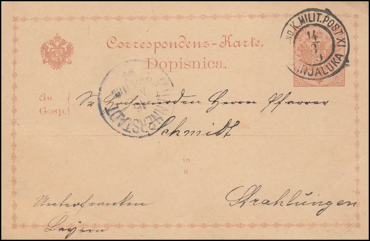 Autriche Poste militaire Carte postale P 3 Armoiries MILIT.POST XI BANJALUKA 1899